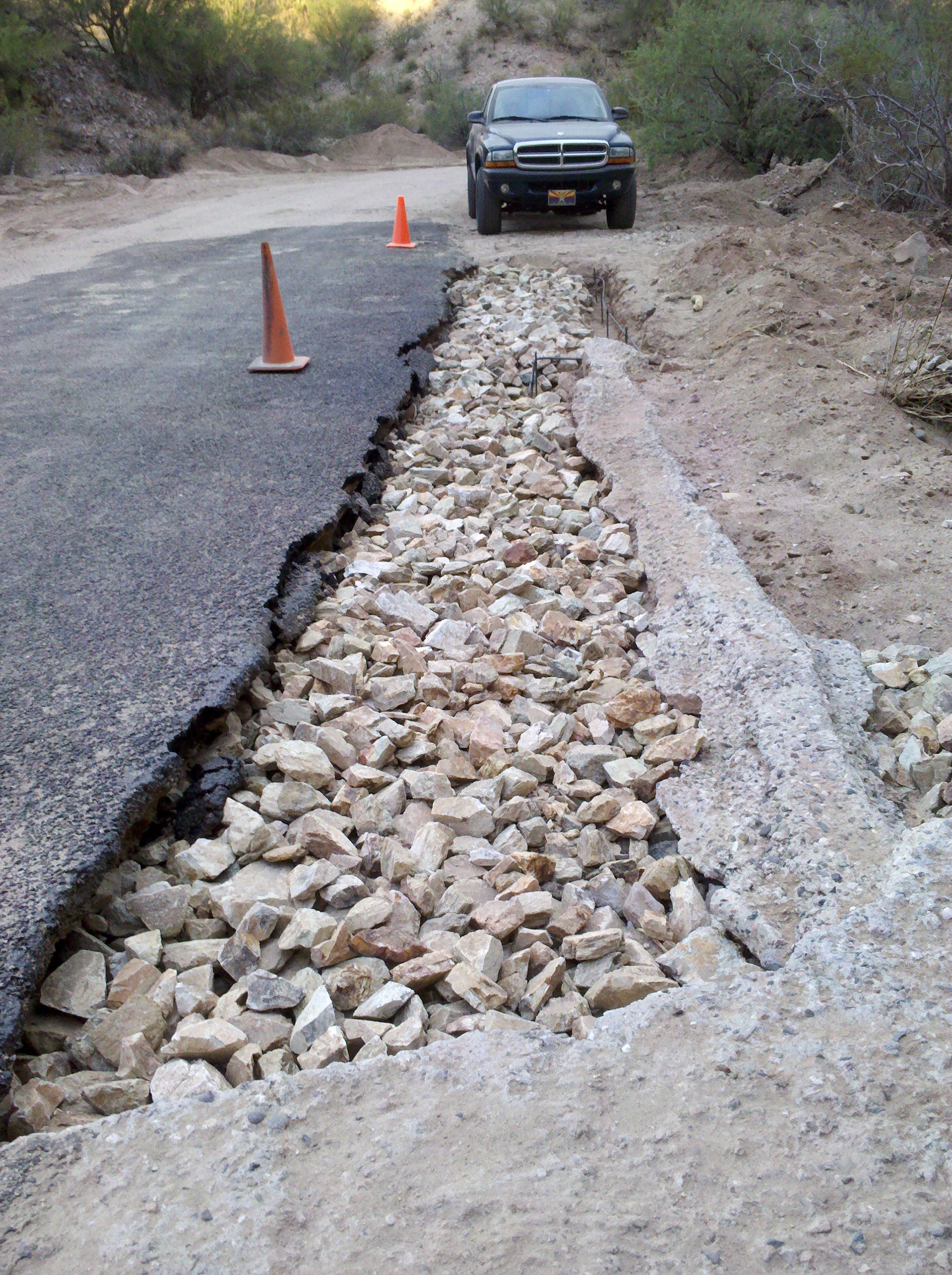 An army of volunteers came together to clear out the worst of the storm damage. A big thank you to all who donated their time, equipment, and diesel to help keep our roads passable and in good repair. Cactus Asphalt was also up to survey some of the more serious damage and the board has identified several problem areas where future flooding can be mitigated. More on that later.